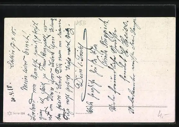 Personenbezogene Daten auf der Rückseite der Karte wurden durch blauen Textmarker unkenntlich gemacht. Die blauen Stellen sind auf die Vorderseite durchgeweicht und wirken sich negativ auf das Postkartenfoto aus