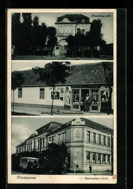 AK Köröstarcsa, Petnehazy-villa, Sprenyi Jozsef füszerkereskedese, Reformatus iskola