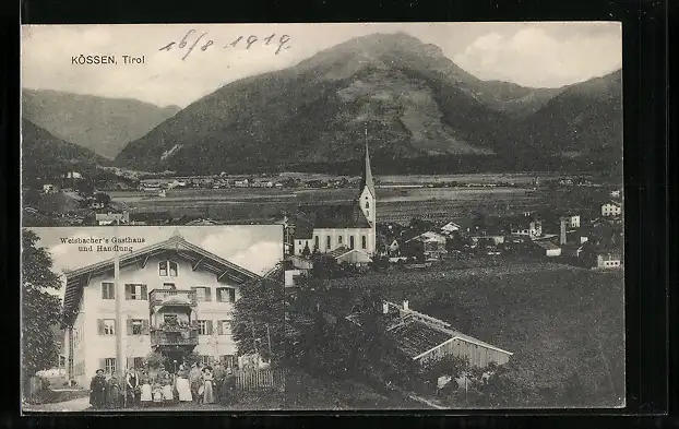 AK Kössen, Ortsansicht, Weisbacher`s Gasthaus und Handlung