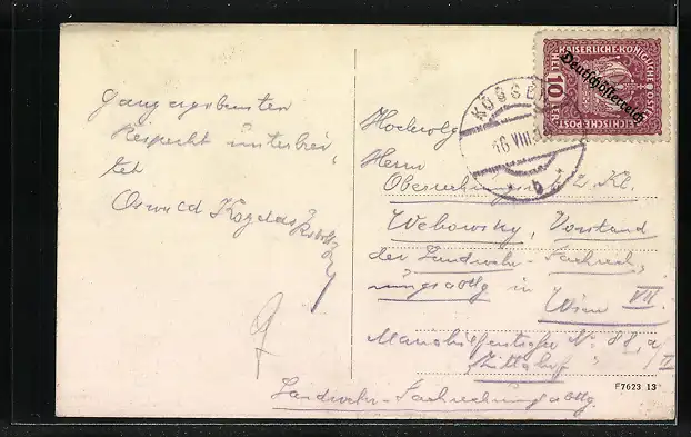 Personenbezogene Daten auf der Rückseite der Karte wurden durch blauen Textmarker unkenntlich gemacht. Die blauen Stellen sind auf die Vorderseite durchgeweicht und wirken sich negativ auf das Postkartenfoto aus