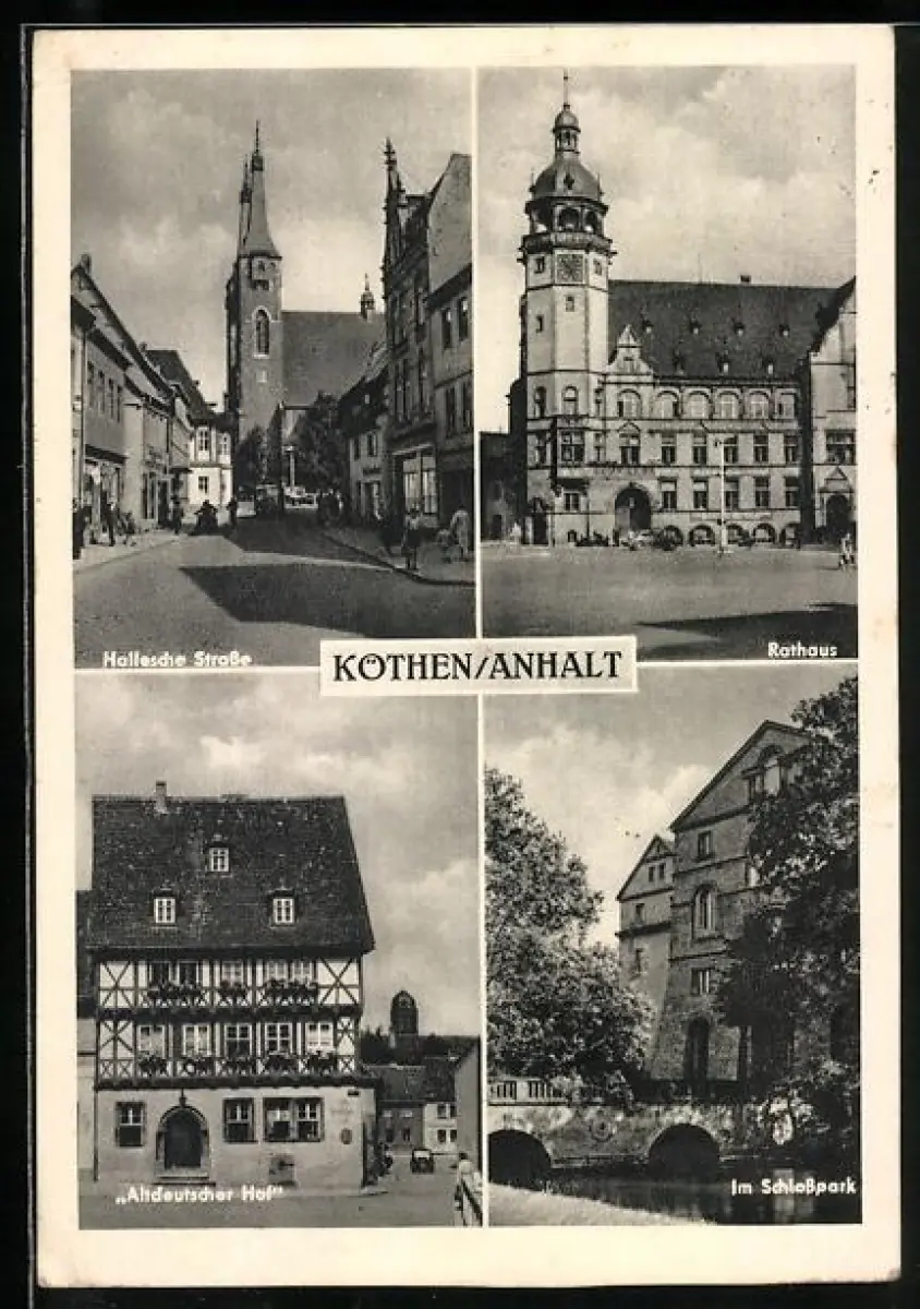 AK Köthen /Anhalt, Hallesche Strasse, Rathaus, Altdeutscher Hof, Partie im Schlosspark