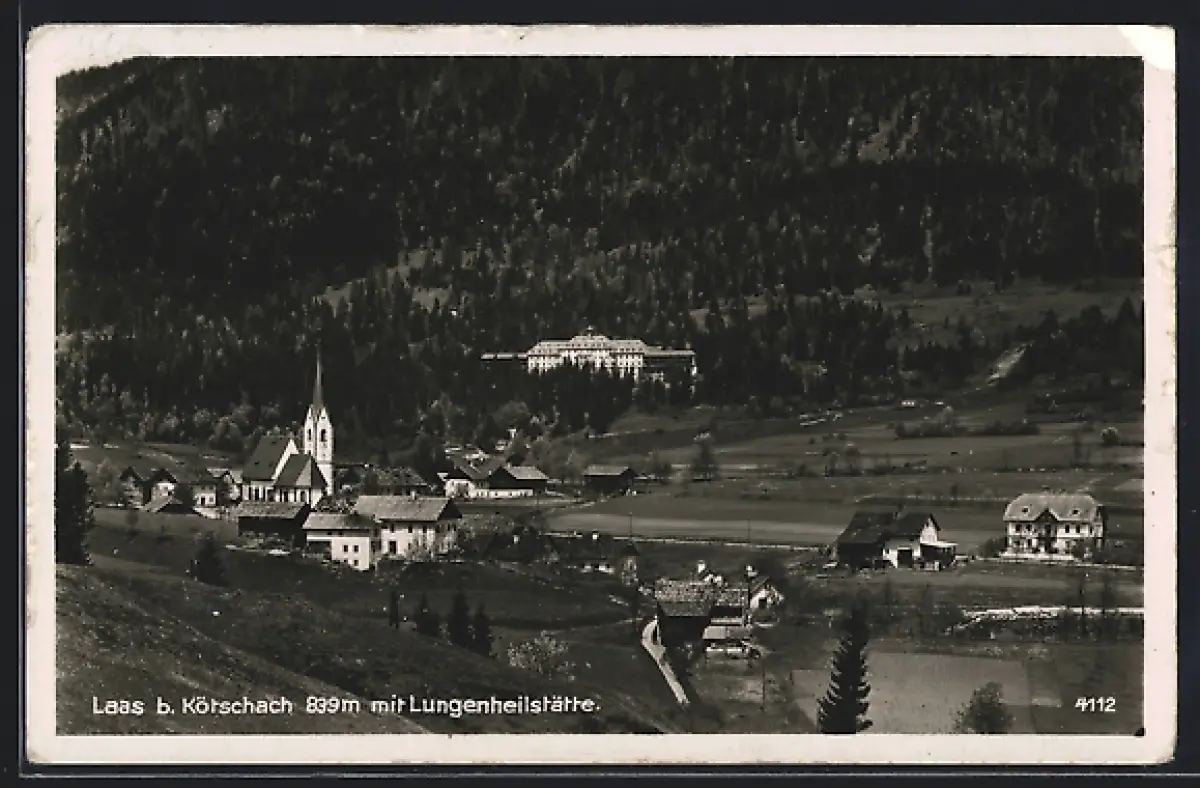 AK Kötschach-Mauthen, Laas, Ortspartie mit Kirche aus der Vogelschau