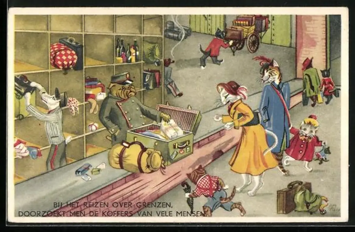 AK Kofferkontrolle an einer Grenze, vermenschlichte Tiere