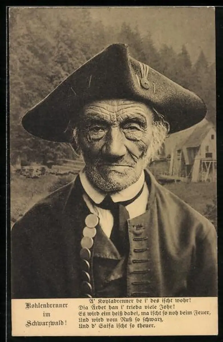 AK Kohlenbrenner im Schwarzwald, alter Mann in Schwarzwälder Tracht