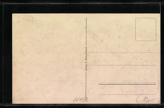 Personenbezogene Daten auf der Rückseite der Karte wurden durch blauen Textmarker unkenntlich gemacht. Die blauen Stellen sind auf die Vorderseite durchgeweicht und wirken sich negativ auf das Postkartenfoto aus