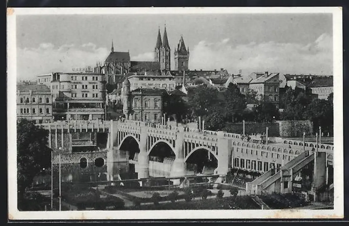 AK Kolín, Teilansicht der Stadt mit Kirche und Brücke