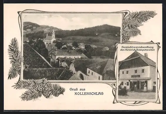 AK Kollerschlag, Gemischtwarenhandlung des Heinrich Rampetsreiter, Ortsansicht