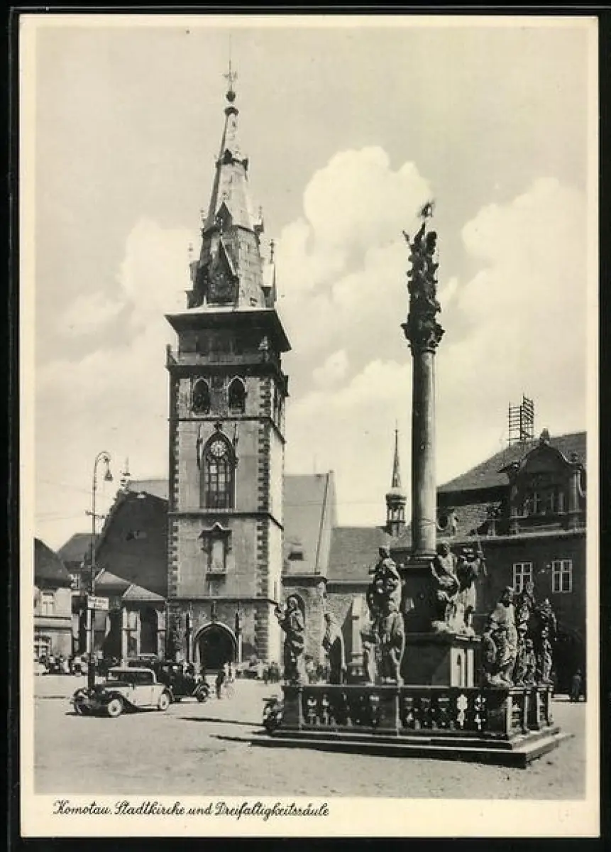 AK Komotau, Ansicht einer Stadtkirche mit Dreifaltigkeitssäule