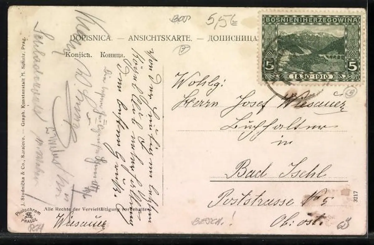 AK Konjica, Teilansicht mit Brücke und Minarettes