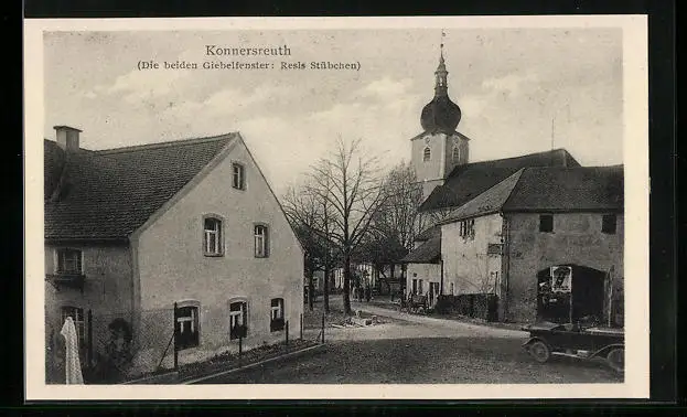 AK Konnersreuth, Die beiden Giebelfenster, Resls Stübchen, Kirche