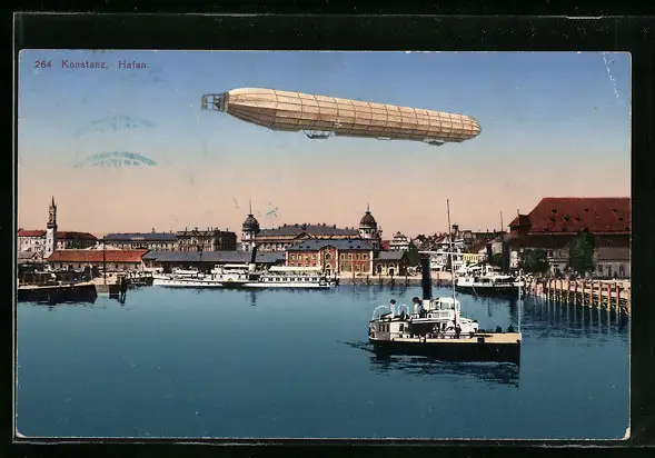 AK Konstanz, Hafen mit Zeppelin, Luftschiff