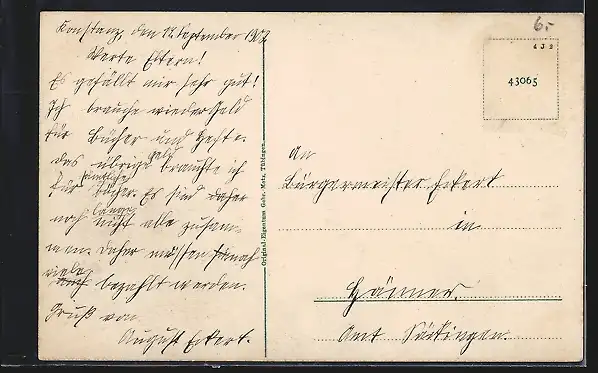 Personenbezogene Daten auf der Rückseite der Karte wurden durch blauen Textmarker unkenntlich gemacht. Die blauen Stellen sind auf die Vorderseite durchgeweicht und wirken sich negativ auf das Postkartenfoto aus