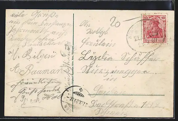 Personenbezogene Daten auf der Rückseite der Karte wurden durch blauen Textmarker unkenntlich gemacht. Die blauen Stellen sind auf die Vorderseite durchgeweicht und wirken sich negativ auf das Postkartenfoto aus