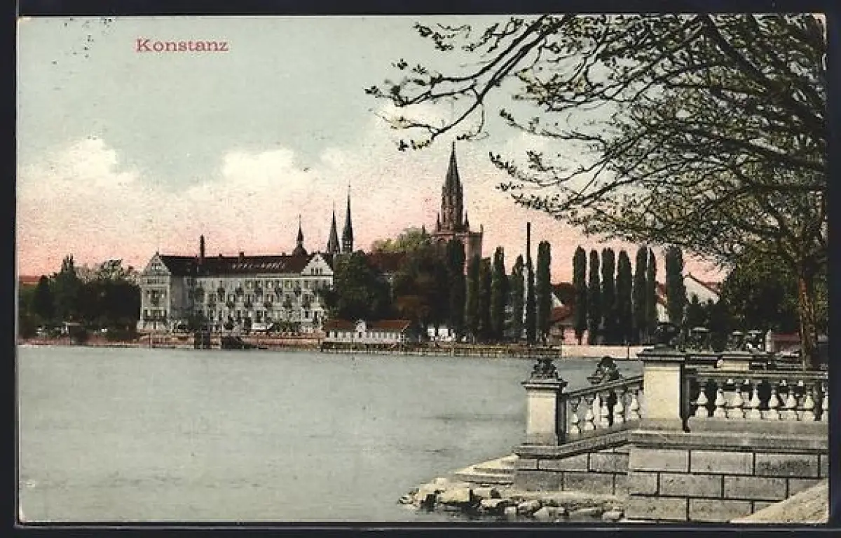 AK Konstanz, Insel-Hotel vom Wasser aus, Balustrade am Ufer