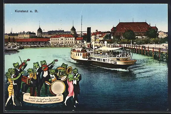 AK Konstanz, Musizierende Frösche am Bodensee, Dampfer