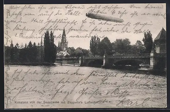 AK Konstanz, Ortsansicht von der Seestrasse mit Zeppelins Luftschiff