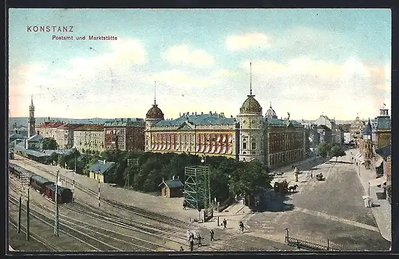 AK Konstanz, Postamt u. Marktstätte mit Strasse aus der Vogelschau, Bahnhof