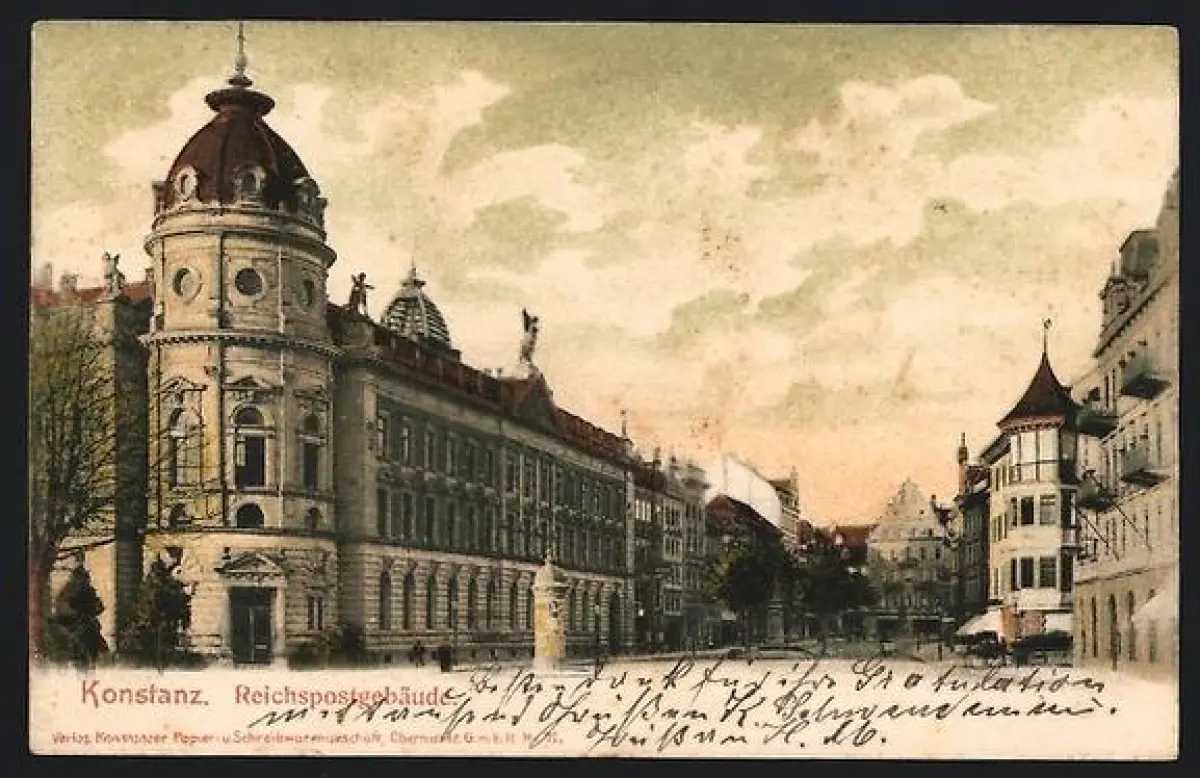 AK Konstanz, Reichspostgebäude mit Litfasssäule