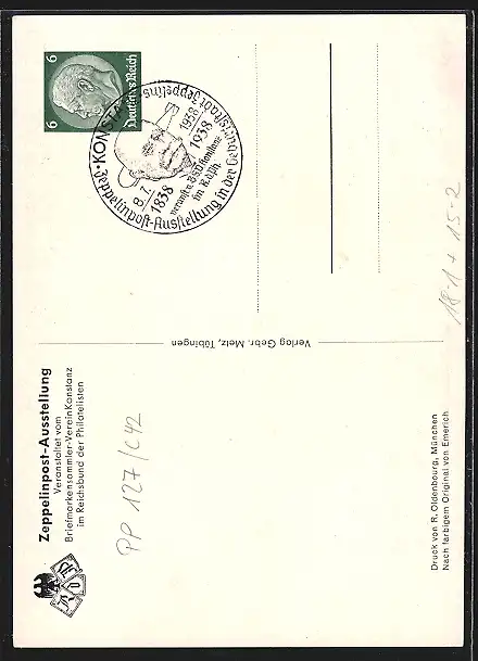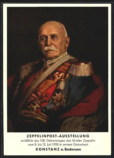 AK Konstanz, Zeppelinpost-Ausstellung 1938, Graf Zeppelin in Gala-Uniform zu seinem 100. Geburtstag, Ganzsache
