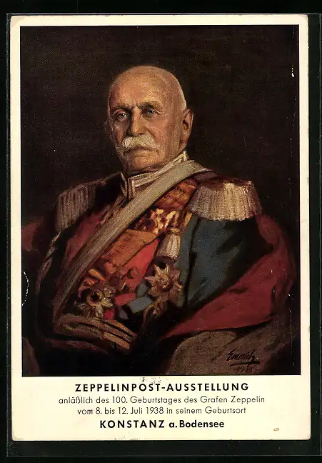AK Konstanz, Zeppelinpost-Ausstellung 1938, Graf Zeppelin in Uniform zu seinem 100. Geburtstag