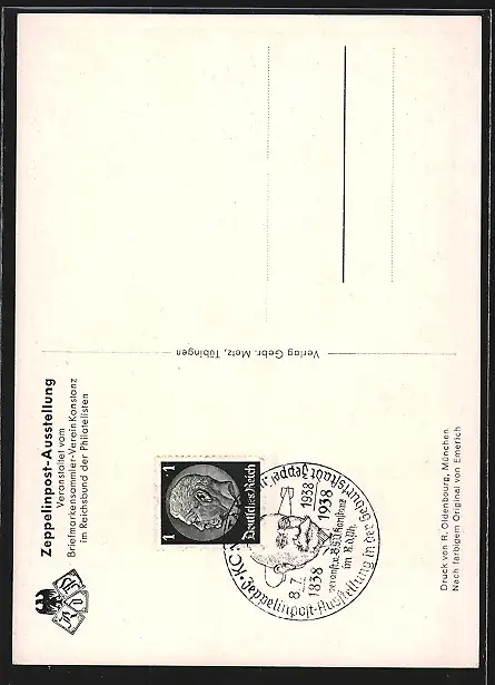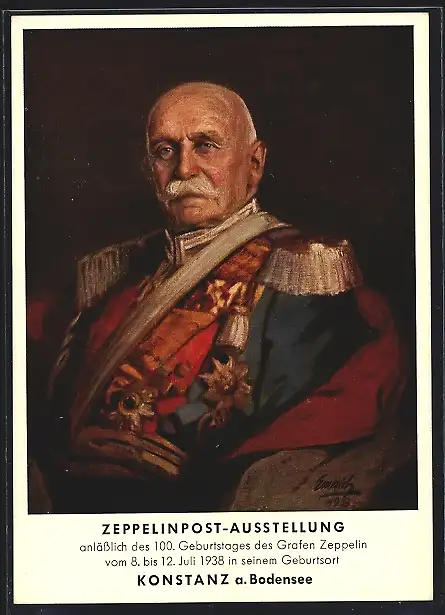 AK Konstanz, Zeppelinpost-Ausstellung, Portrait des Grafen Zeppelin in Uniform, zum 100. Geburtstag, im Juli 1938