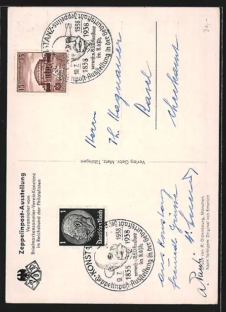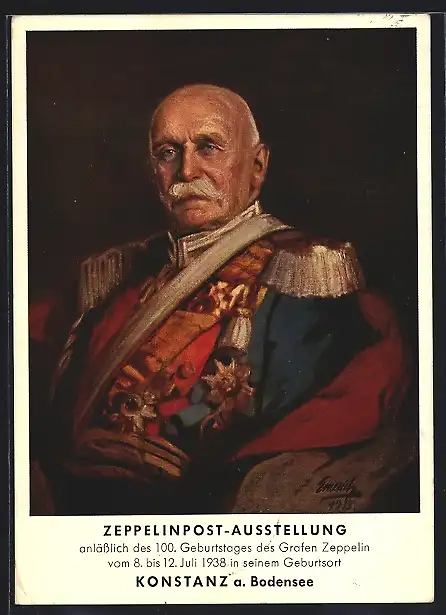 AK Konstanz, Zeppelinpost-Ausstellung, Portrait des Grafen Zeppelin in Uniform, zum 100. Geburtstag, im Juli 1938