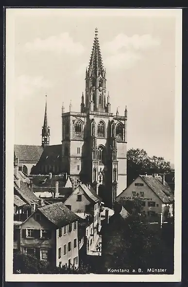 AK Konstanz a. B., Strassenpartie mit Cafe-Restaurant und Münster