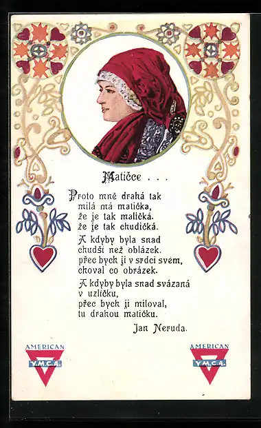 AK Konterfei einer tschechischen Frau in Tracht mit Kopftuch, Gedicht von Jan Neruda