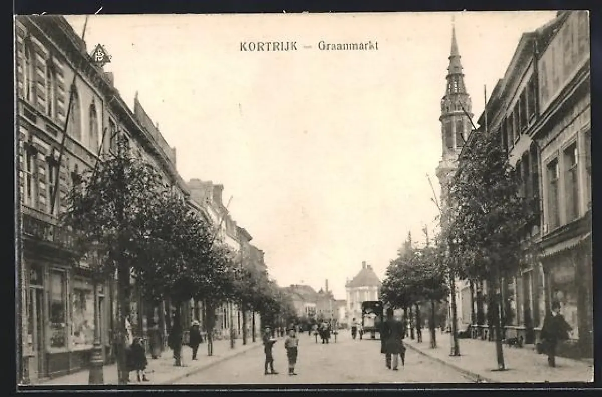 AK Kortrijk, Graanmarkt mit Strassenleben