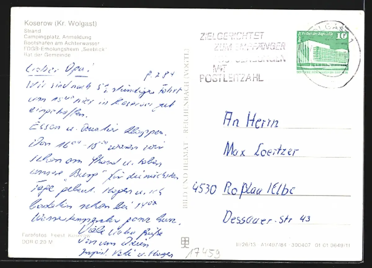 alte Ansichtskarte, gelaufen 1984, Eckknicke re., guter Zustand