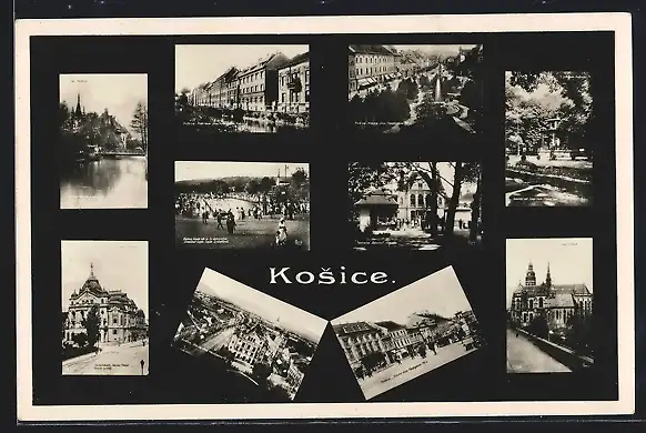 AK Kosice, Verschiedene Stadtansichten: Kirche, Schwimmbad, Strassenpartie, Ortsansicht aus der Vogelschau