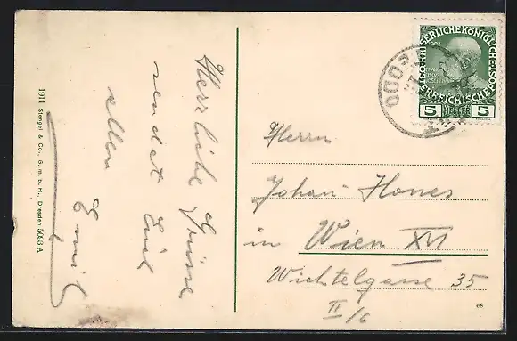 Personenbezogene Daten auf der Rückseite der Karte wurden durch blauen Textmarker unkenntlich gemacht. Die blauen Stellen sind auf die Vorderseite durchgeweicht und wirken sich negativ auf das Postkartenfoto aus