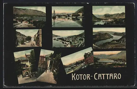 AK Kotor, Strassenpartien, Boote im Hafen, Bergpanorama