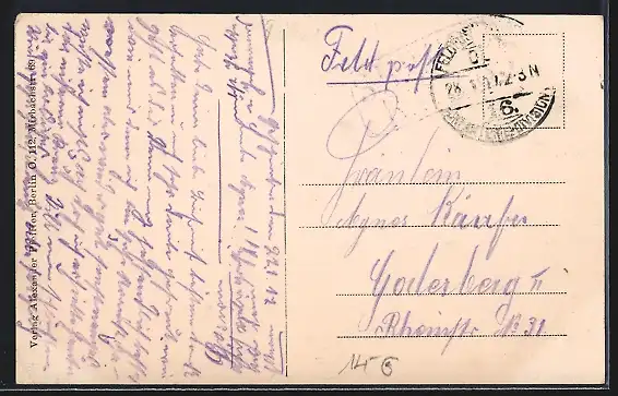 Personenbezogene Daten auf der Rückseite der Karte wurden durch blauen Textmarker unkenntlich gemacht. Die blauen Stellen sind auf die Vorderseite durchgeweicht und wirken sich negativ auf das Postkartenfoto aus