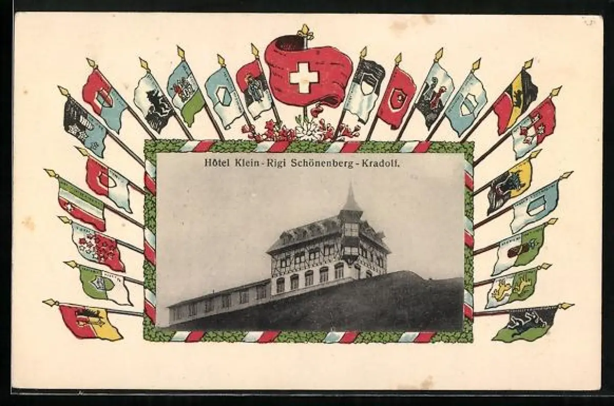 AK Kradolf-Schönenberg, Hotel Klein-Rigi, Eichenblattrahmen mit Schweizer Flaggen