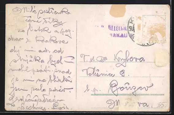 Personenbezogene Daten auf der Rückseite der Karte wurden durch blauen Textmarker unkenntlich gemacht. Die blauen Stellen sind auf die Vorderseite durchgeweicht und wirken sich negativ auf das Postkartenfoto aus