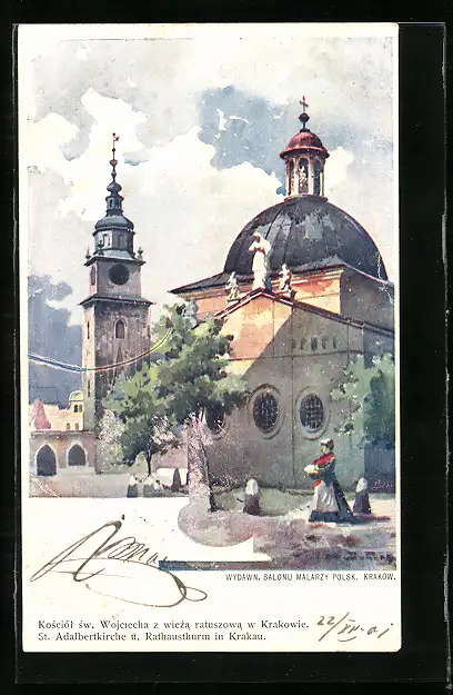 AK Kraków, St. Adalbertkirche und Rathausturm