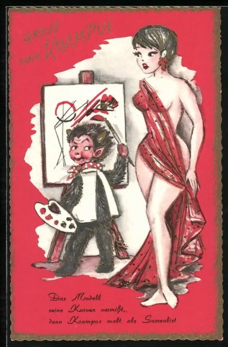 AK Krampus als Surrealist mit halbnackter Dame, Gruss vom Krampus