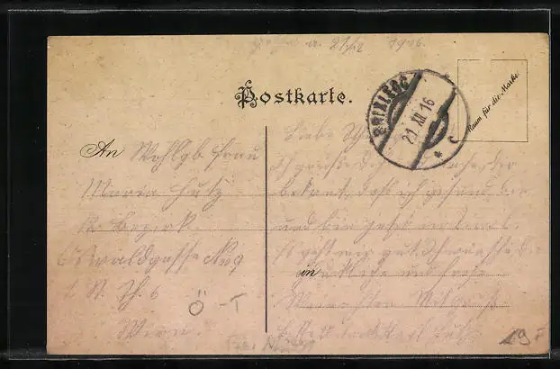 alte Ansichtskarte, gelaufen 1916, Eckknicke li. unten u. re., rückseitig Oberflächenschaden, Stempelspur, guter Zustand