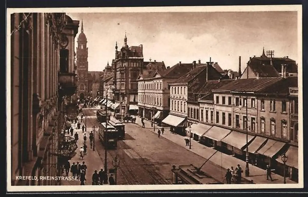 AK Krefeld, Blick in die Rheinstrasse mit Strassenbahn