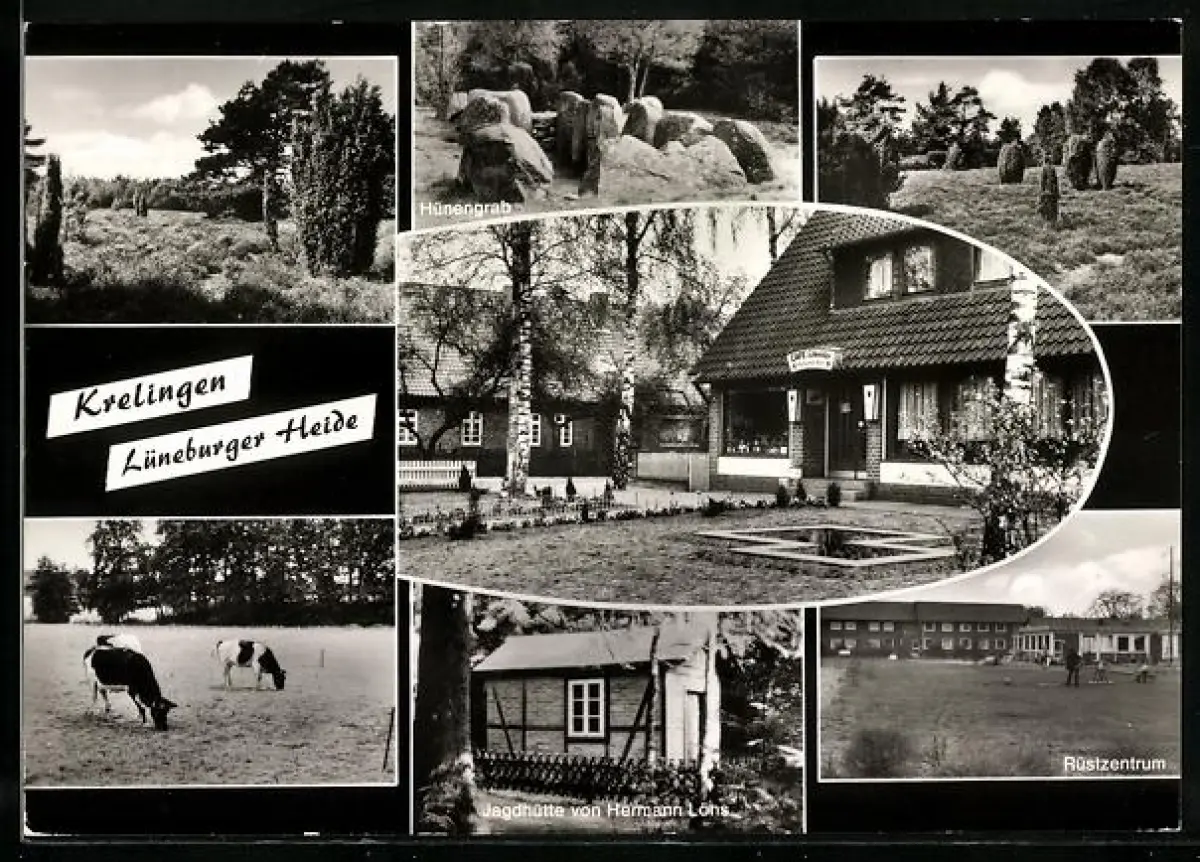 AK Krelingen /Lüneburger Heide, Hünengrab, Jagdhütte von Hermann Löns, Rüstzentrum, Café Schröder