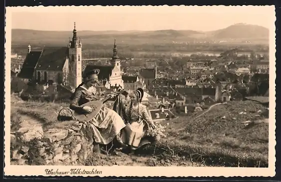 AK Krems /Donau, Wachauer Volkstrachten u. Teilansicht mit Kirche