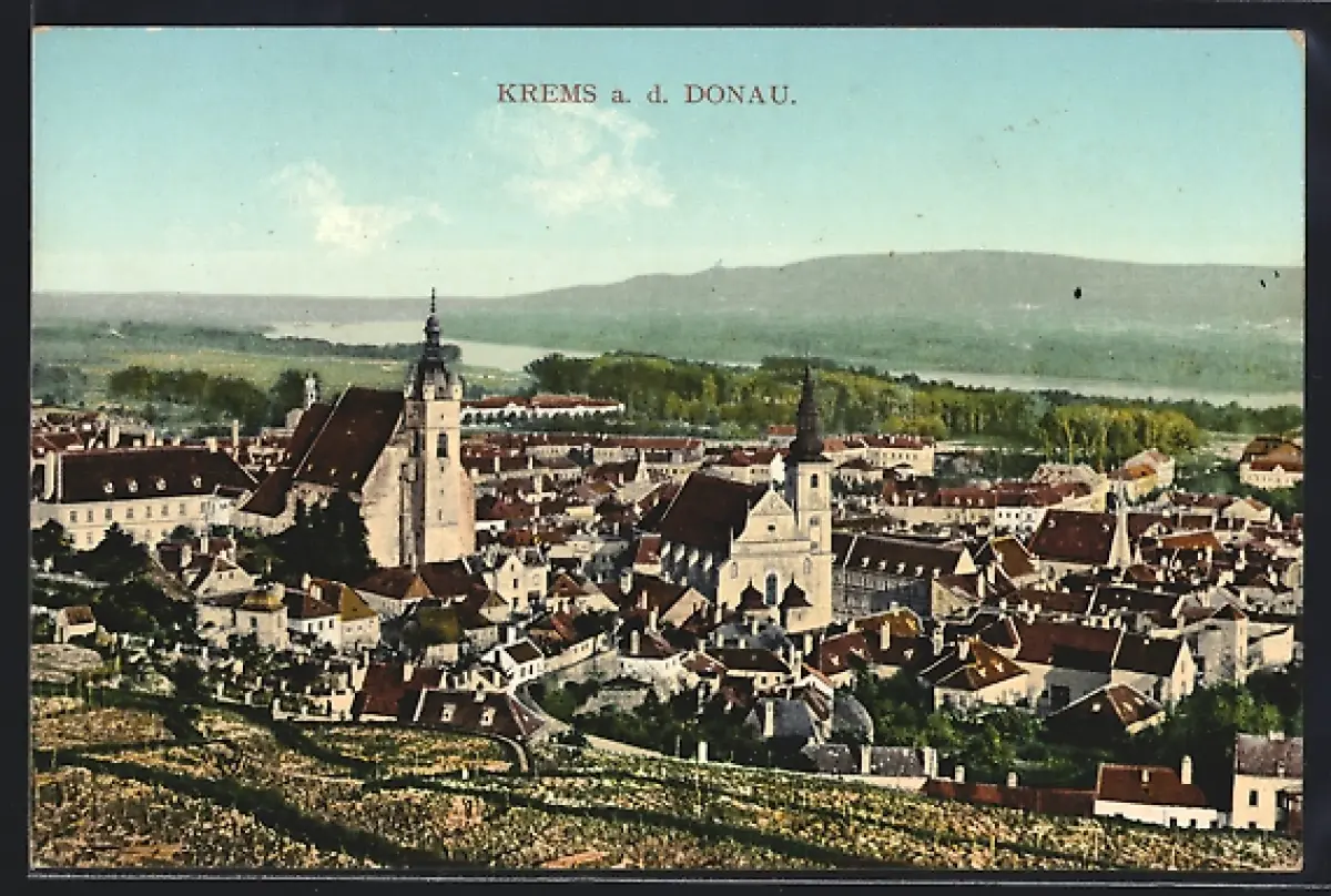 AK Krems a. d. Donau, Totalansicht mit Donaublick aus der Vogelschau