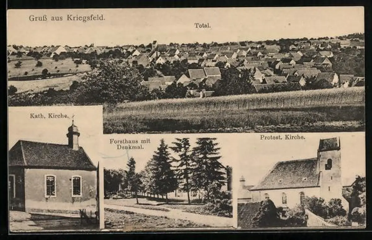 AK Kriegsfeld, Panorama des Ortes, Katholische und Protestantische Kirche, Forsthaus mit Denkmal