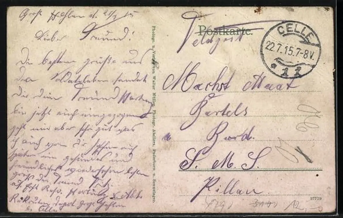 alte Ansichtskarte, gelaufen 1915, Bugspuren oben li. u. mittig, linke Kante beschnitten
