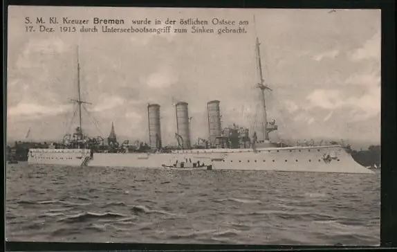 AK Kriegsschiff S.M. Kl. Kreuzer Bremen, durch U-Boot versenkt