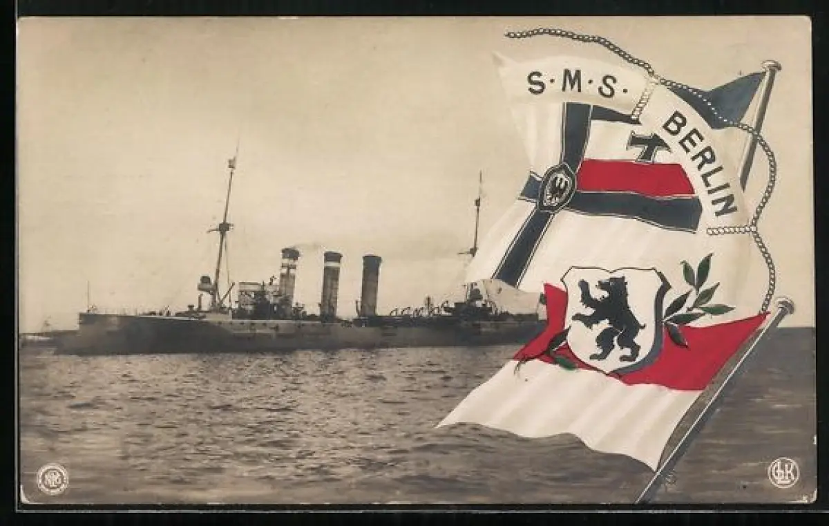 AK Kriegsschiff S.M.S. Berlin im Wasser, Reichskriegsflagge und Berliner Wappen