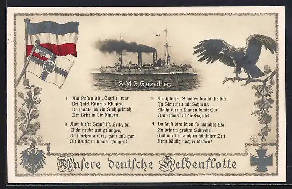 AK Kriegsschiff SMS Gazelle in voller Fahrt, Ostasiengeschwader, Reichskriegsflagge, Gedicht, Reichsadler