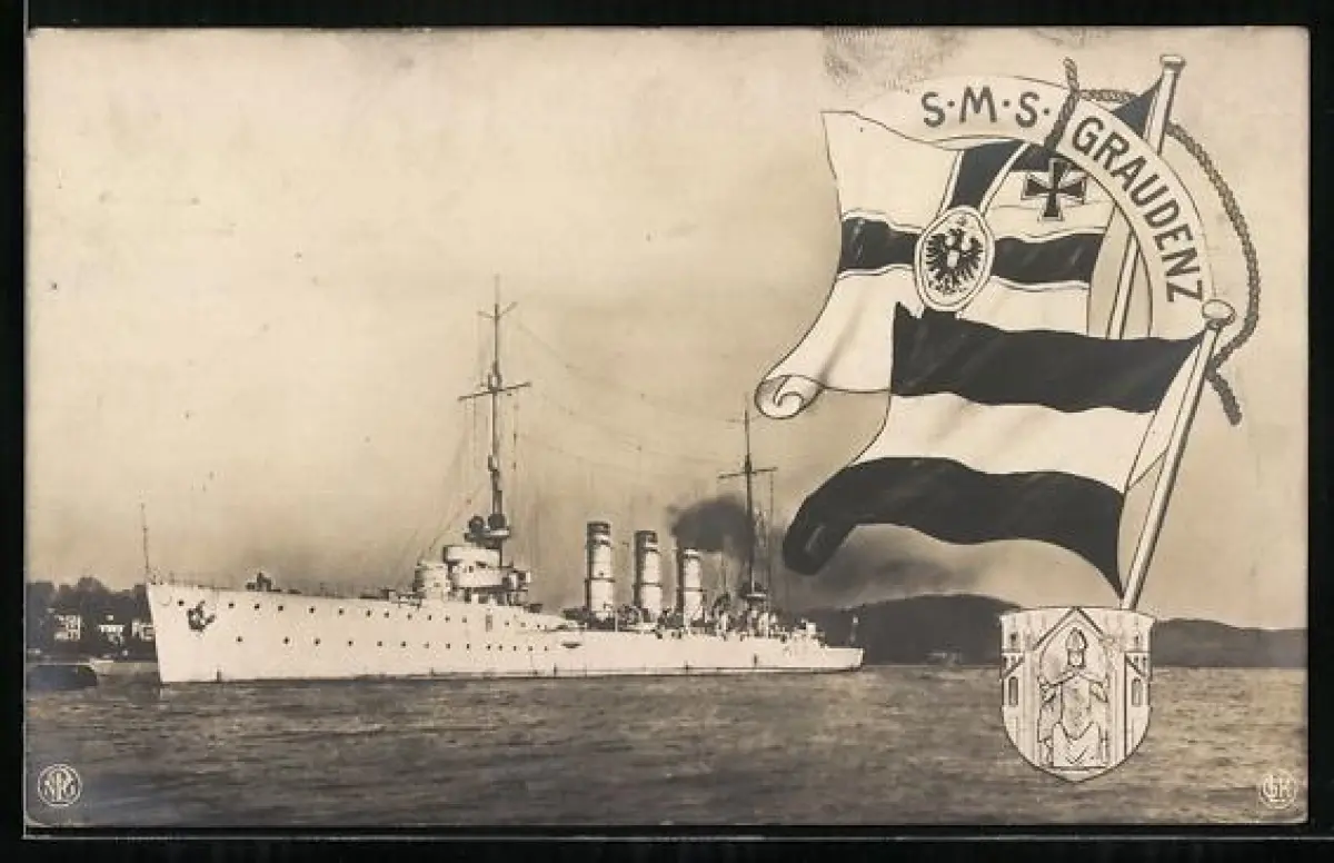 AK Kriegsschiff S.M.S. Graudenz vor der Küste, Reichskriegsfahne