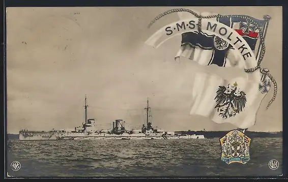 AK Kriegsschiff S.M.S. Moltke vor einer Küste, Reichskriegsflagge und Wappen